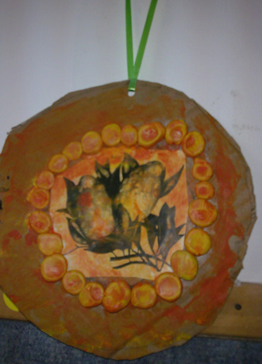 For the upper grades they worked on a precut cardboard circle, they drew a circle using the stencil and glued a photocopy of a citrus fruit in the middle.